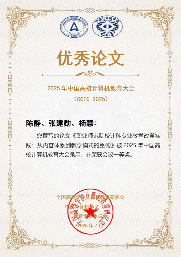 近日, 2025年中国高校计算机教育大会(CCEC 2025)在银川成功举办。本次大会上,学院张建勋和陈静分别撰写的两篇论文荣获2025年中国高校计算机教育大会(CCEC2025)论文一等奖,彰显了禁漫天堂 在计算机教育领域的教学研究实力与创新成果。张建勋团队撰写的《基于一致性建构的研究生课程思政教学研究与实践》聚焦研究生课程思政建设,探索教学融合新路径,被推荐至《计算机技术与教育学报》发表;陈静团队撰写的《职业师范院校计科专业教学改革实践:...