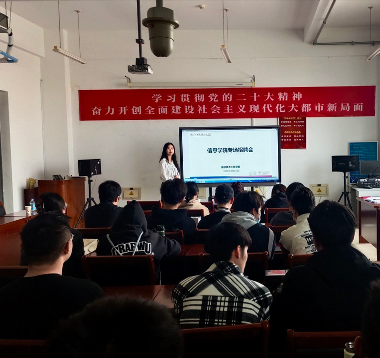 随后,职联科技有限公司人事部的韩经理和孙经理分别为同学们做了学业规划指导和人才招聘宣讲,韩经理从大学生就业的心理问题入手,针对大学生在工作中遇到的问题,提出了自己的建议和看法,为对未来就业迷茫的学生指明了方向。最后,孙经理进行了就业招聘的宣讲,从公司简介、业务介绍、招聘岗位和发展空间四个方面进行了具体介绍,结合学院专业开设情况,该公司为学院2023届毕业生提供了助教和运维工程师2个岗位,共计划招聘16人。对毕业生关心的工作要求、薪资福利、公司环境、未来发展等方面问题进行了现场答疑并收取了毕业生的简历。