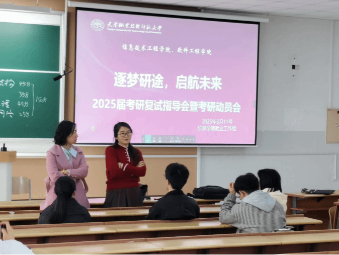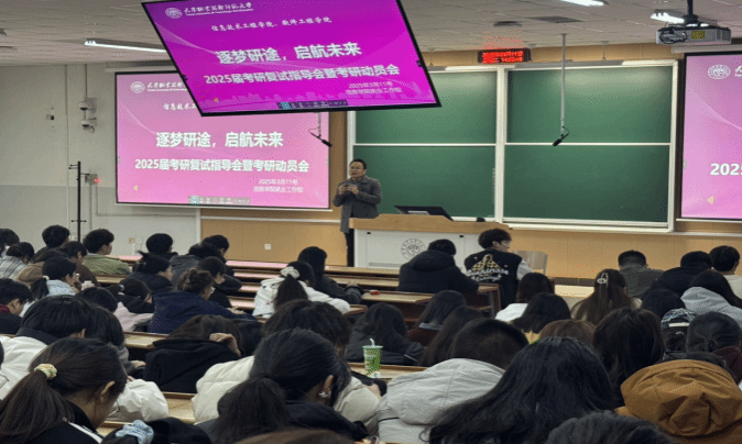于2025年3月11日下午在第三教学楼108室举办2025届考研复试指导会暨考研动员会。院党委副书记王蕾、副院长余秋冬、考研指导教师代表、优秀毕业生代表及200余名学生共同参加本次活动。